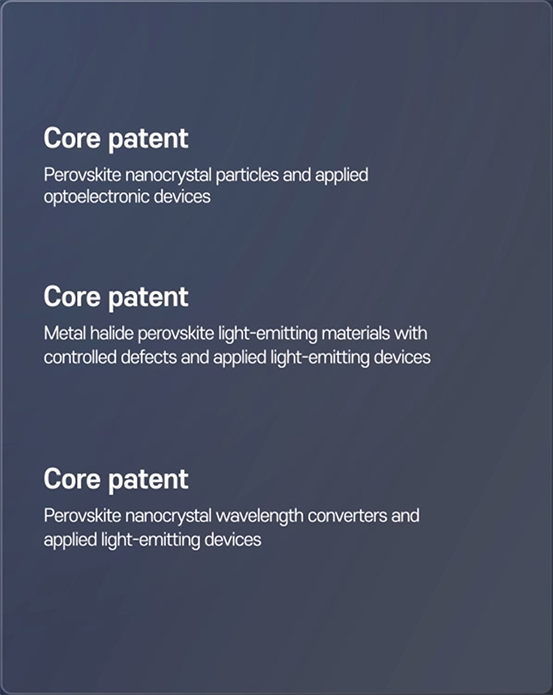 SN Display holds the first foundational patents of Perovskite light-emitter, applied for in 2014, establishing our position as the leading group in this field with a strong research background. We have demonstrated that intrinsic lattice structure of perovskite materials enables particle size-independent light emission, providing exceptional color purity beyond the limits of quantum confinement effects of conventional inorganic quantum dots.[1] Our patents also cover key innovations, including core-shell structures,[2] gradient alloys,[3] 2D structures,[4] organic ligand substitutions,[5] all of which significantly enhanced optical properties and stability of perovskite nanocrystal.