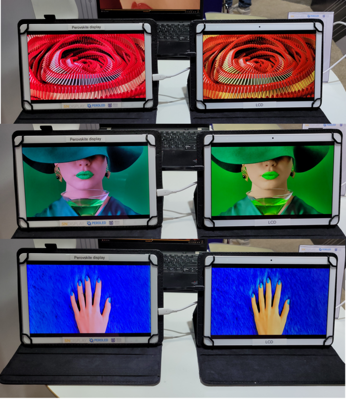 SN Display attended CES in Las Vegas earlier this month and introduced a prototype of a display using 75-inch perovskite light-emitting materials. The left is a perovskite display, and the right is a normal display. [Picture = Professor Lee Taewoo's research team]