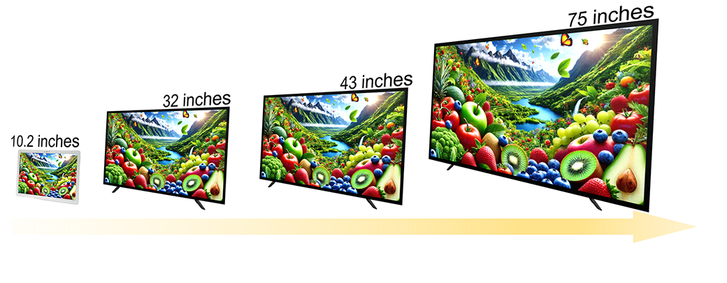 Using cost-effective roll-to-roll coating, we successfully fabricated 100-meter-long films for our prototype 75-inch TV(September, 2023), and we are now realizing mass production. Our current product lineup includes 10.2-inch, 32-inch, 43-inch displays and further customable, and all displays showed wide color gamut coverage of 90-100% of Rec. 2020, the highest ever produced in displays.
